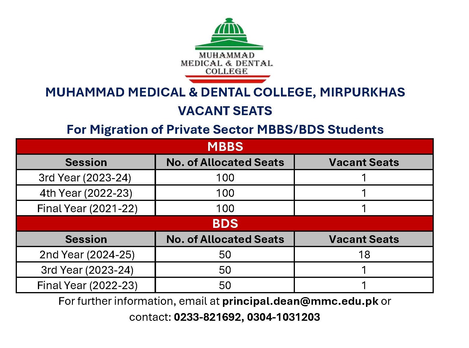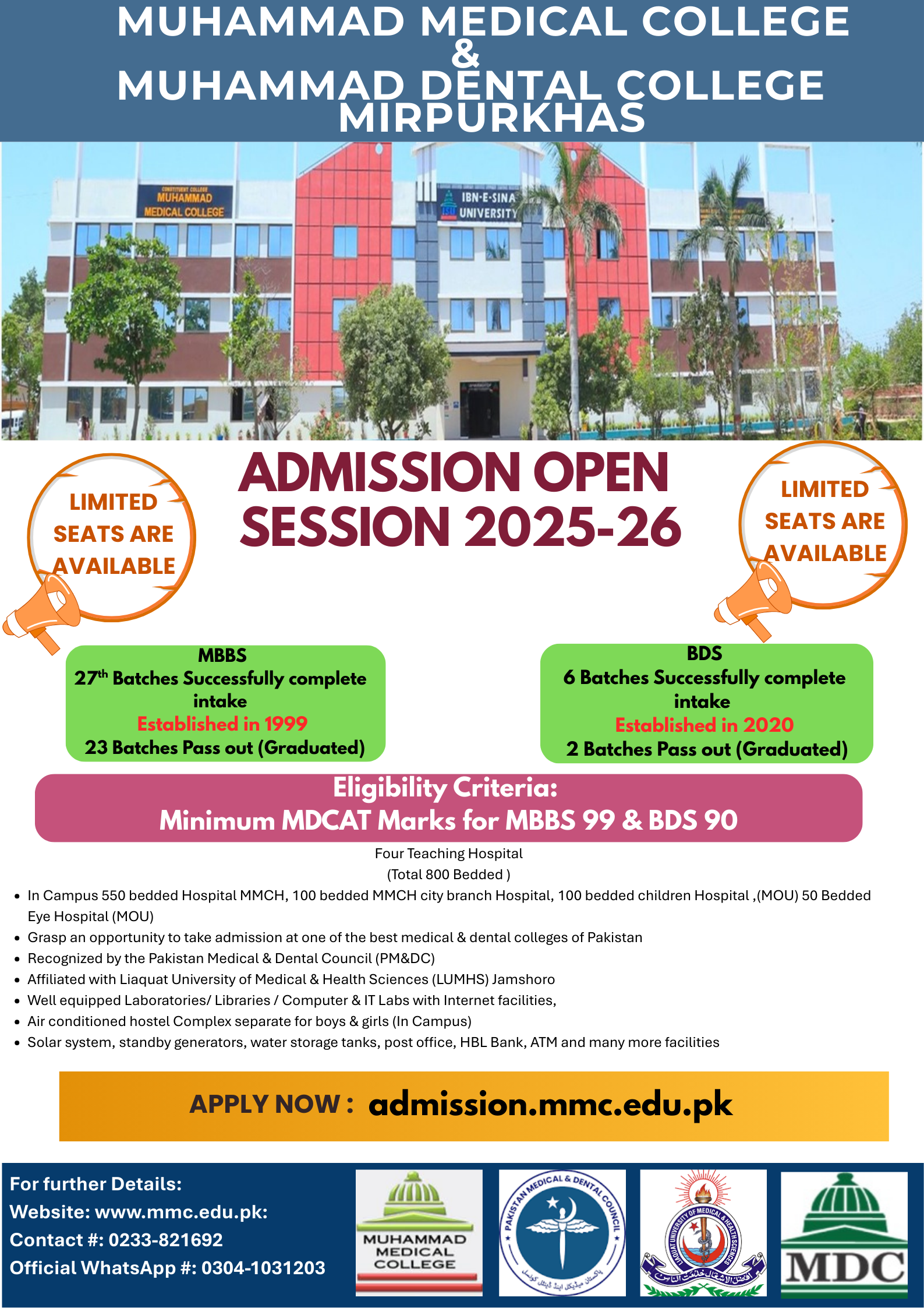 Muhammad Medical College is located just outside Mirpurkhas (6 km from Zero point) on Hyderabad road. This is opposite Ratanabad Railway station near main bus stand. It spreads over 40 acres owned by Muhammad Foundation Trust for its projects. All necessary facilities including building, gas, electricity, telephone, e-mail. Internet, transport, accommodation, food and drink spots are available. Public transport operating along Hyderabad road provides frequent and regular access to the college. The college building is more than sufficient to the requirement and has all the necessary departments. Each department has its own museum, laboratory and tutorial room, whichare well equipped and fascinating. All facilities aremodern and up-to the mark. Students get clinical training in nearby 500 bedded Muhammad Medical college Hospital. There are hostels for boys and girls onsite and in the city. A new large state of art 3 stories girls' hostel has just been established onsite